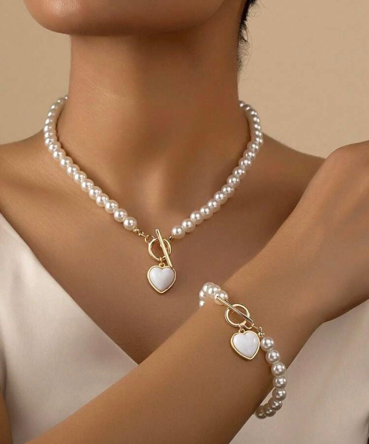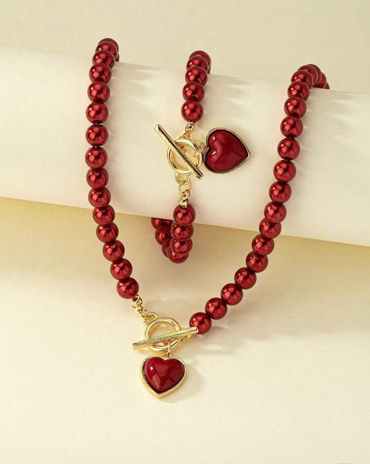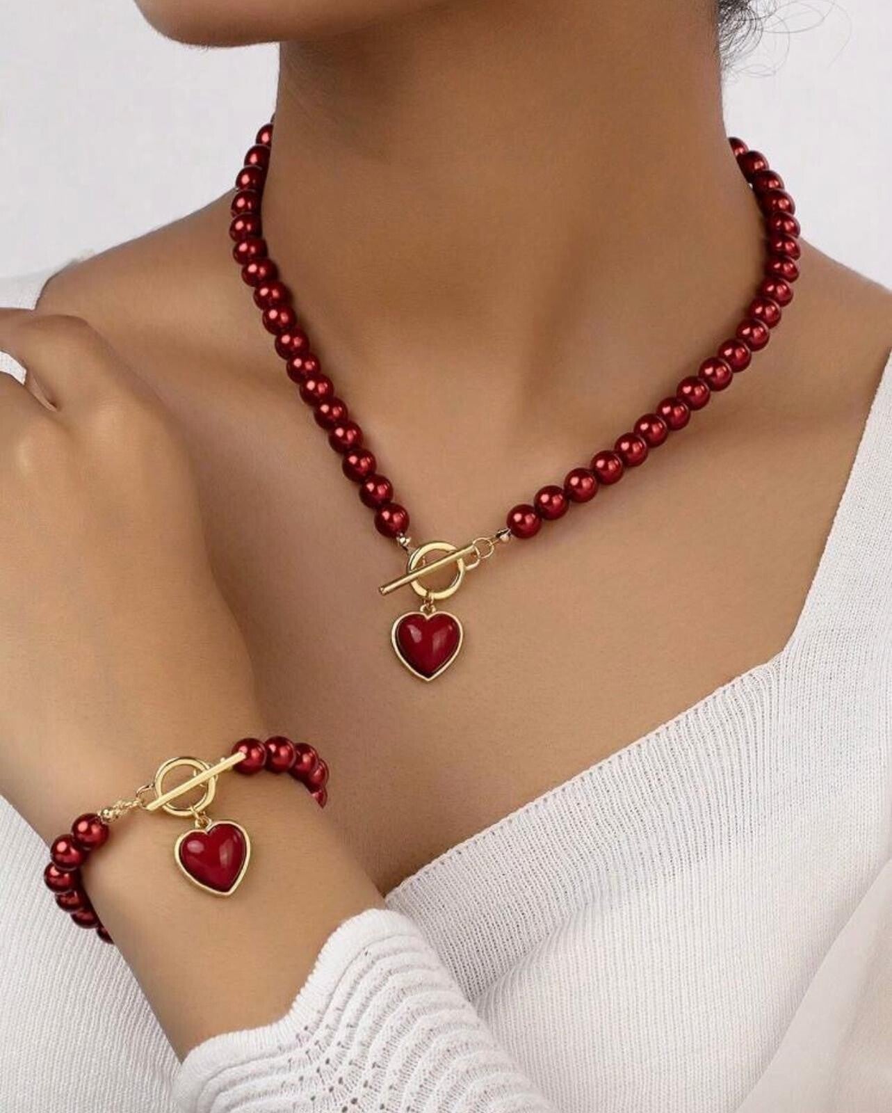 Set bracciale e collana in perle rosse e ciondolo a cuore